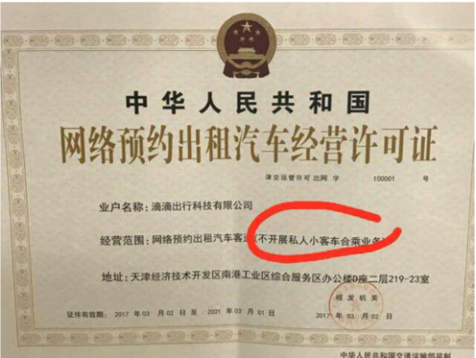 一般来说，括弧中间的字是用来注解与补充说明的，而在滴滴《网络预约出租汽车经营许可证》中的括弧内的文字（不开展私人小客车合乘业务）却显得非常亮眼。这说明天津有关部门即非常重视小客车合乘业务，又非常清楚小客车合乘业务和滴滴出行这样的平台之间的利害关系。<br />