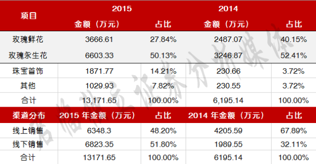 鲜花、永生花是销售收入的主要来源。2014 年、2015年鲜花、永生花销售收入合计占营业收入的比重分别为92.56%、77.97%。此外公司以玫瑰为产品核心理念，积极开发珠宝首饰等产品品类并取得良好市场效果，营业收入显著增加。<br />