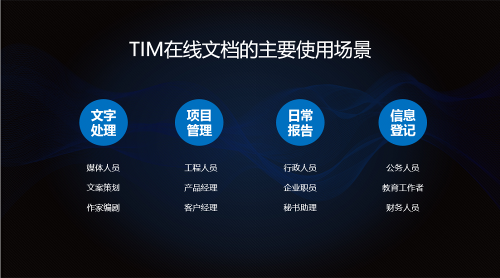 根据TIM的用户分析，多人在线文档用户中男性占比达到76.5%，18-30岁用户是在线文档的主力军，占比达到71.4%，文档类型表格胜出，占比58%。在线文档功能主要用于文字处理、项目管理、日常报告和信息登记等工作。在这些工作中，很多都涉及到保密性的问题，在线文档进行社交关系链授权的方式，有效地保证了文档信息的安全性。<br />