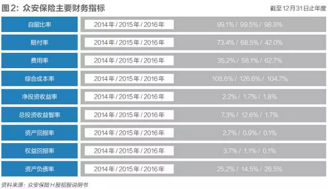 众安保险资产端的投资收益起伏不定，负债端则面临高企的业务成本。众安保险招股说明书显示，2014年-2016年，综合成本率分别为108.6％、126.60％和104.70％。从决定综合成本率高低的两大指标来看，费用率分别为35.2％、58.10％和62.70％，赔付率分别为73.4％、68.5％、42％。以2016年为例，这三个指标分别高于99.52％、39.85％和59.94％的财险业平均水平。<br />