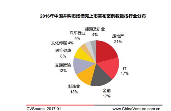 分行业而言，房地产行业在2016年中国并购市场借壳上市宣布数量，达到21%。其中2016年10月，中国恒大表态将借壳深深房最为引人关注。<br />