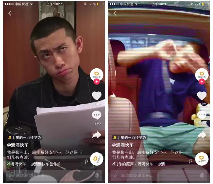 抖音最新的一支广告来自滴滴快车，这段短视频上线后已经获得了超过70万次点赞。滴滴快车的账号收获了42.3万粉丝。<br />