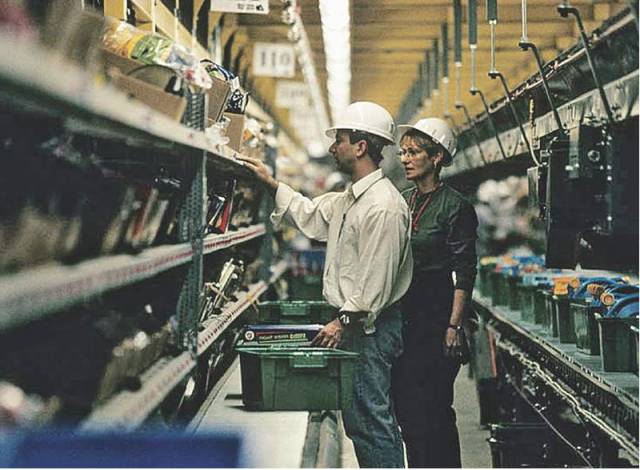 贝佐斯在订单履行中心检查玩具供应线（图来自《一网打尽：贝佐斯与亚马逊时代》）<br />