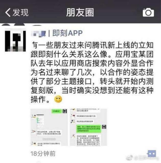 即刻方面表示，&ldquo;有一些朋友过来问腾讯新上线的立知跟即刻什么关系这么像。应用宝某团队去年以应用商店搜索内容外显合作为名过来聊了几次，以合作的姿态提供了部分主体接口，转头就开始内测复刻版，当时确实没有想到还能有这种操作。&rdquo;<br />