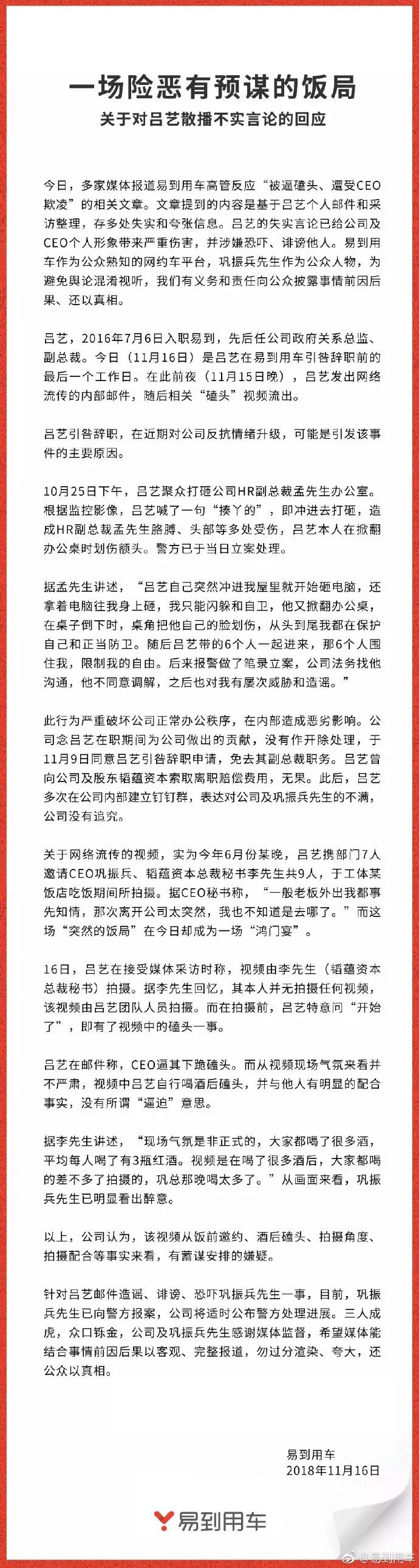 11月16日上午，易到发布第一份声明称，视频没有交代饭局背景，且现场氛围与邮件所称的"逼迫"不符。<br />