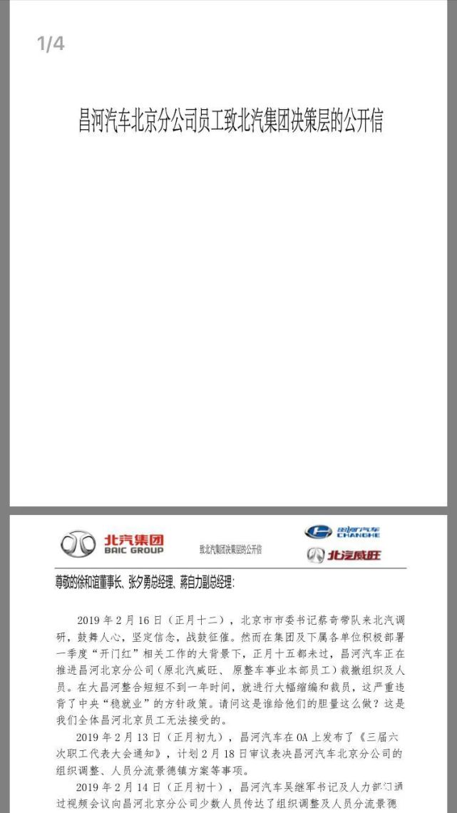 比如说2019年2月20日，当时昌河汽车北京分公司的40多位员工代表，集体到北汽总部上书徐和谊，一跃成为各大汽车媒体的头版头条。<br />