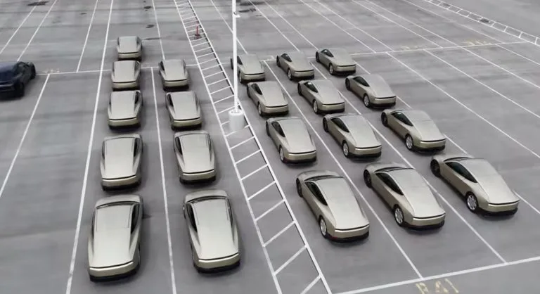 整个园区内可见约 50 辆 Cybercab，整齐密集地排成行列。大部分车辆仍保留方向盘和踏板，这是特斯拉为满足现行安全法规而加装的临时装置，以便在无方向盘设计获得全面监管批准前，积累真实道路数据。<br />