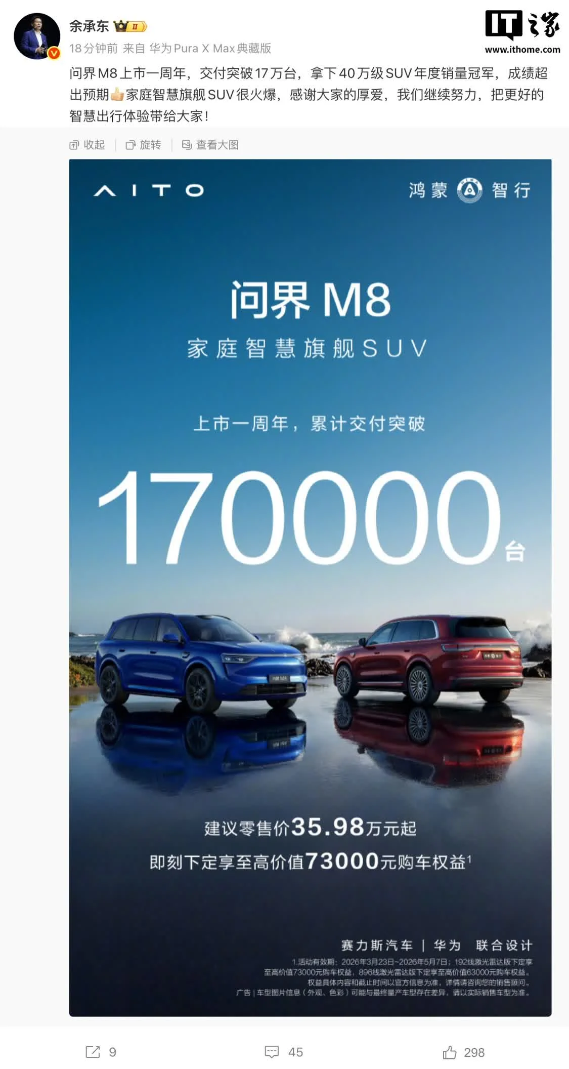 <p>4 月 16 日消息，今天午间，华为常务董事、产品投资委员会主任、终端 BG 董事长余承东宣布：问界 M8 上市一周年，交付突破 17 万台，拿下 40 万级 SUV 年度销量冠军，成绩超出预期。<br />